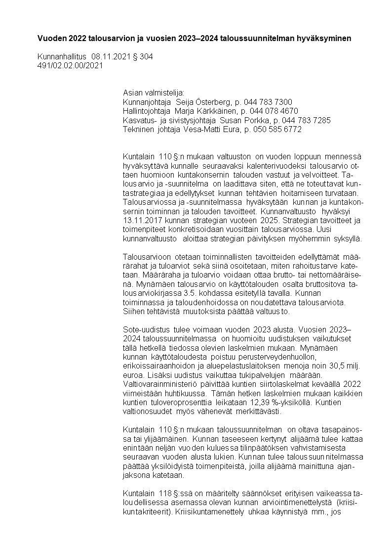 Pöytäkirja 08.11.2021/Pykälä 304