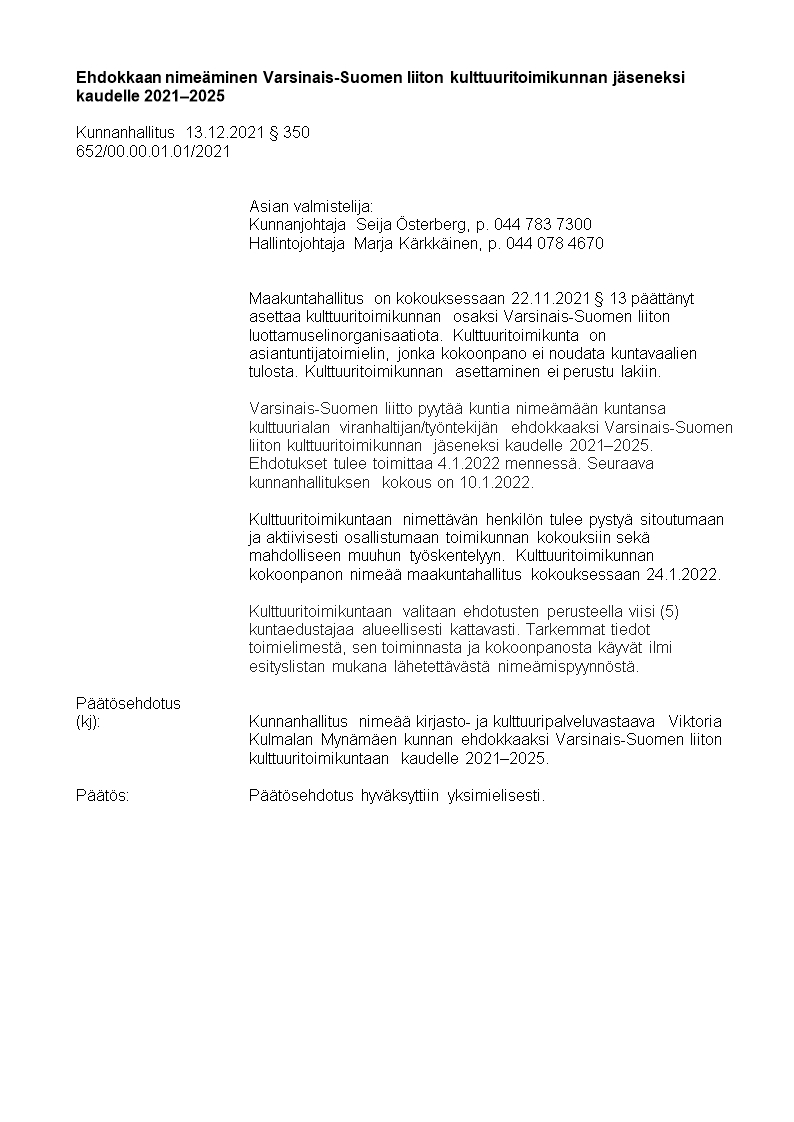 Pöytäkirja 13.12.2021/Pykälä 350
