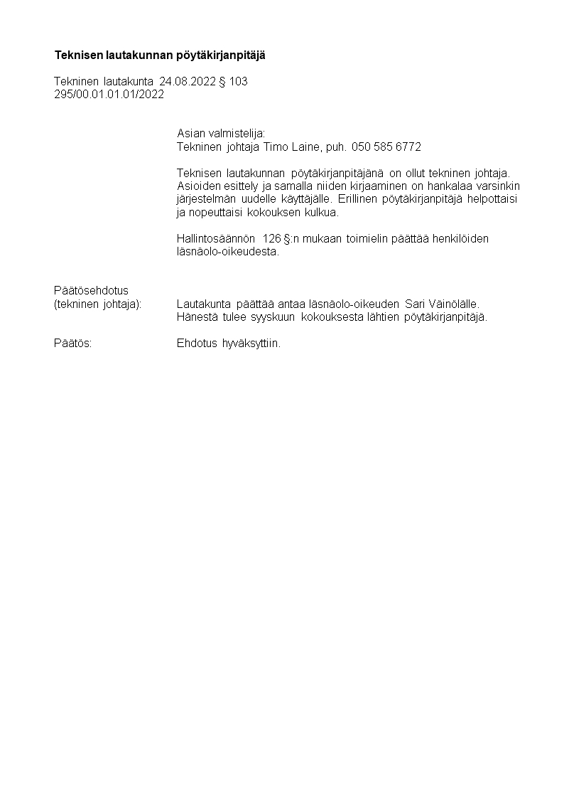 Pöytäkirja 24.08.2022/Pykälä 103