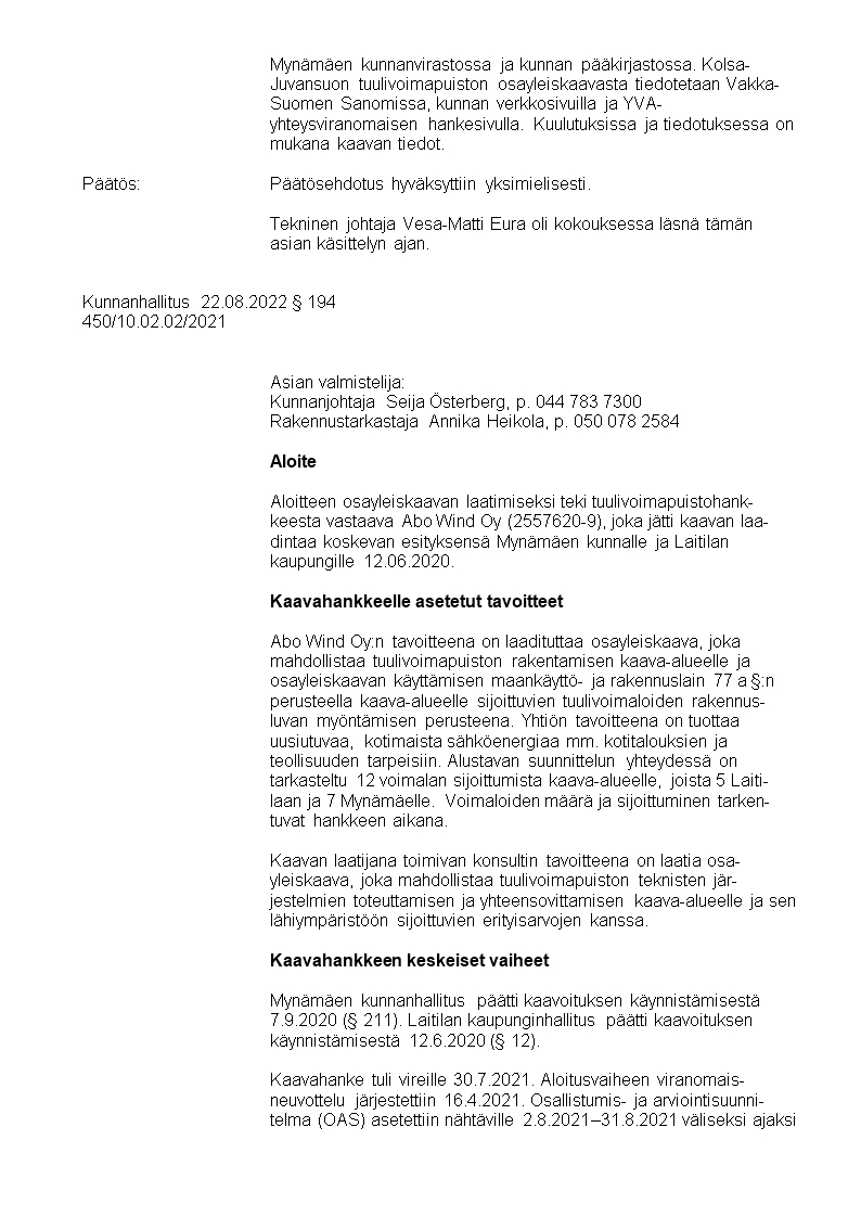 Pöytäkirja 22.08.2022/Pykälä 194