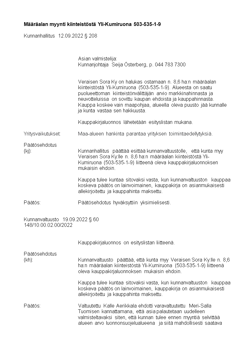 Kauppakirjaluonnos määräalan myynnistä kiinteistöstä Yli-Kumiruona 503-535-1-9 |