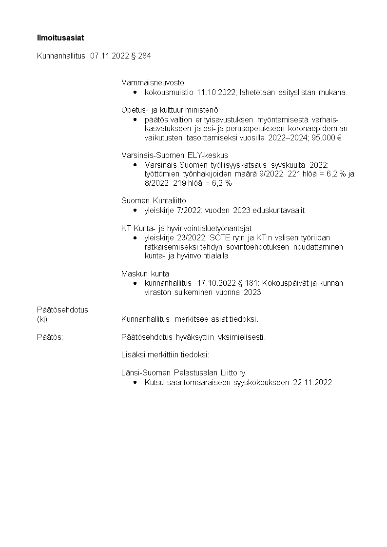 Pöytäkirja 07.11.2022/Pykälä 284