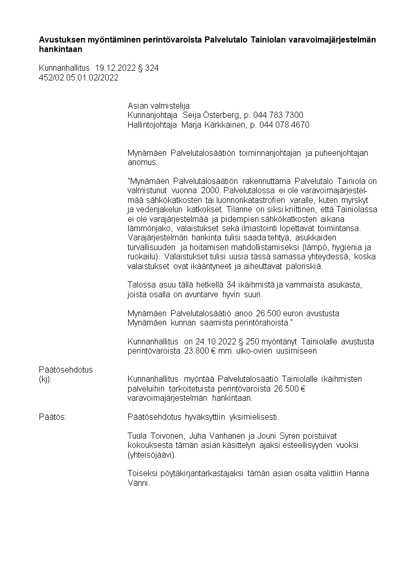 Pöytäkirja 19.12.2022/Pykälä 324
