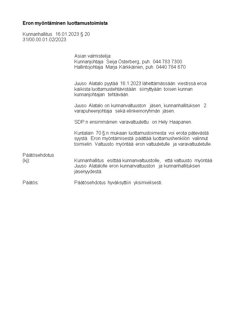 Pöytäkirja 16.01.2023/Pykälä 20