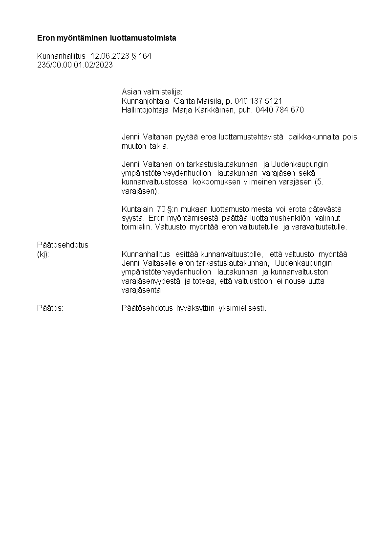 Pöytäkirja 12.06.2023/Pykälä 164