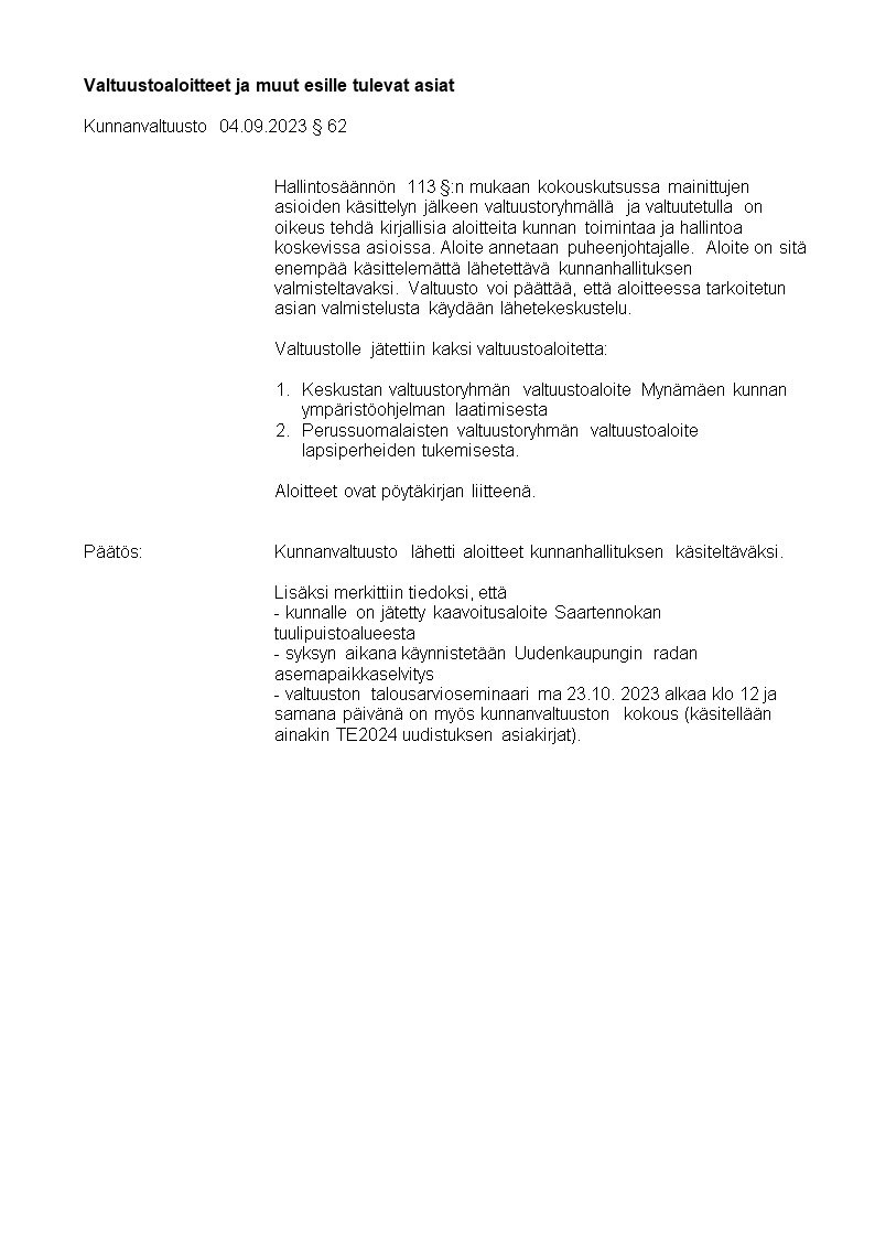 Keskustan valtuustoryhmän valtuustoaloite Mynämäen kunnan ympäristöohjelman laatimisesta |