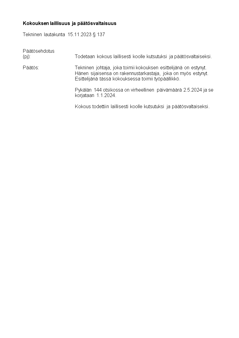 Pöytäkirja 15.11.2023/Pykälä 137