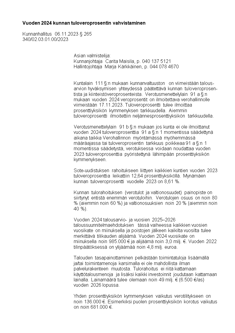 Pöytäkirja 06.11.2023/Pykälä 265