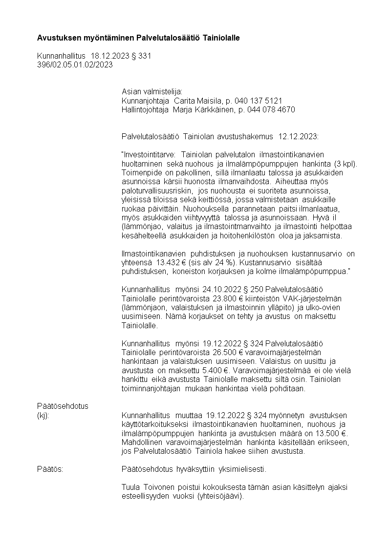 Pöytäkirja 18.12.2023/Pykälä 331