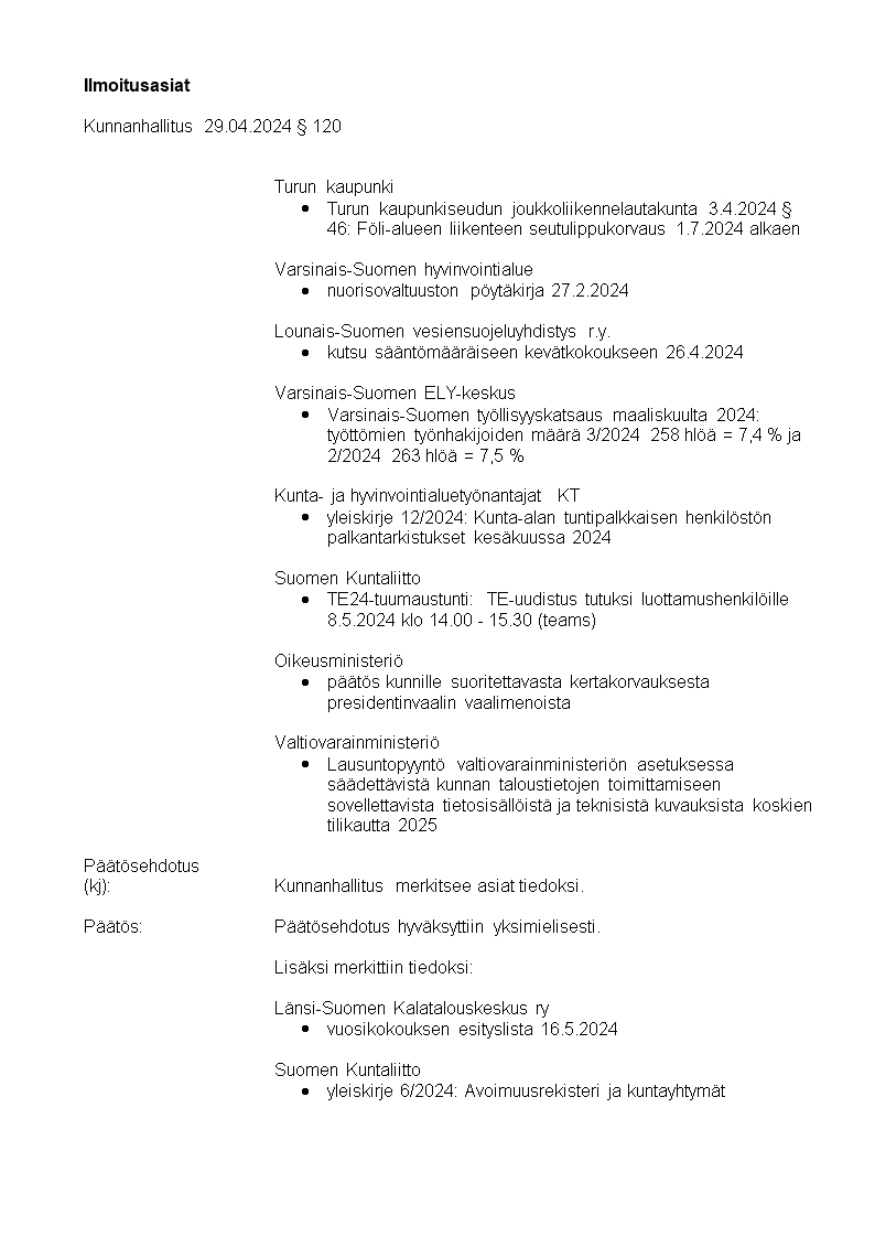 Pöytäkirja 29.04.2024/Pykälä 120