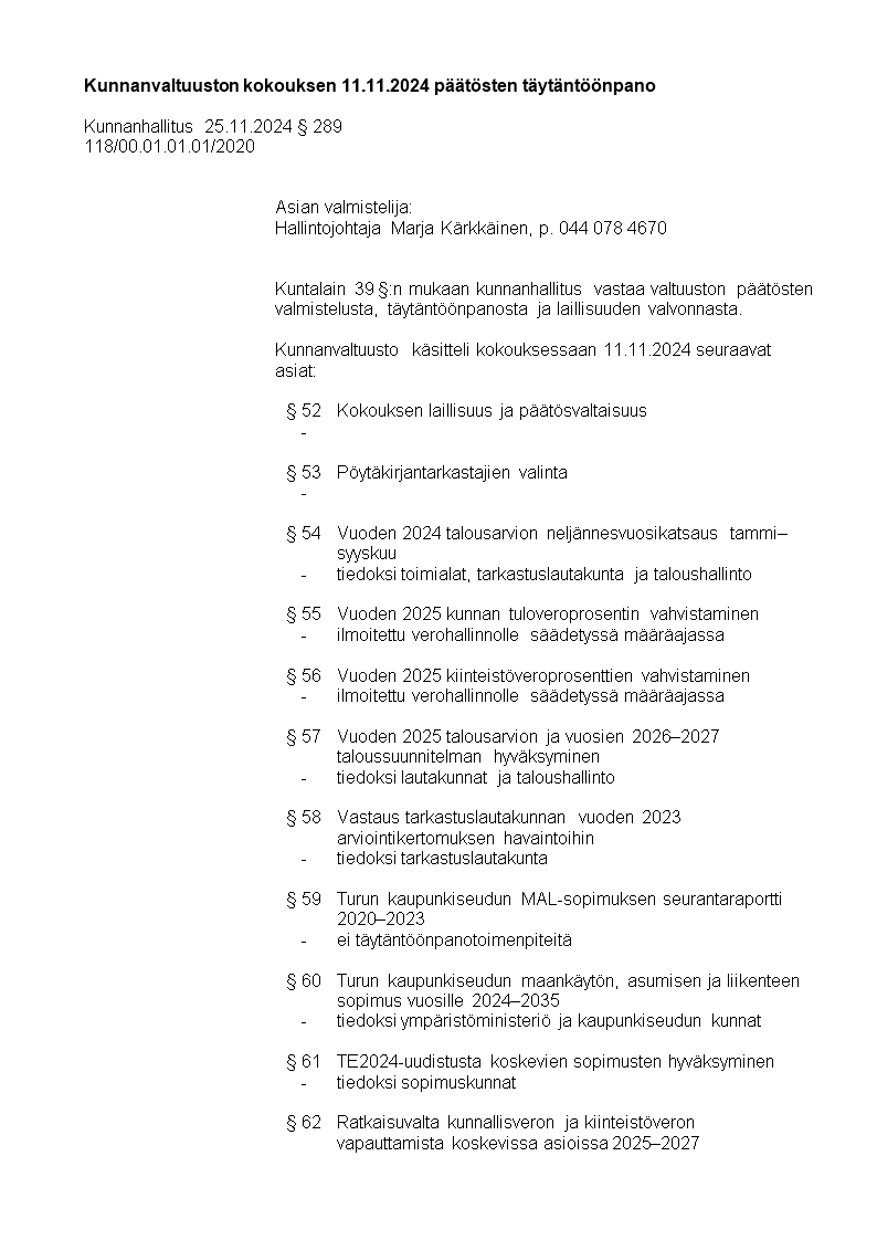 Pöytäkirja 25.11.2024/Pykälä 289