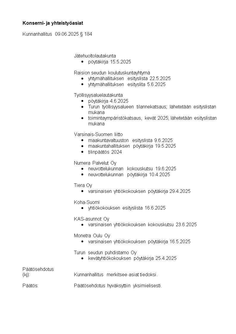 Pöytäkirja 09.06.2025/Pykälä 184