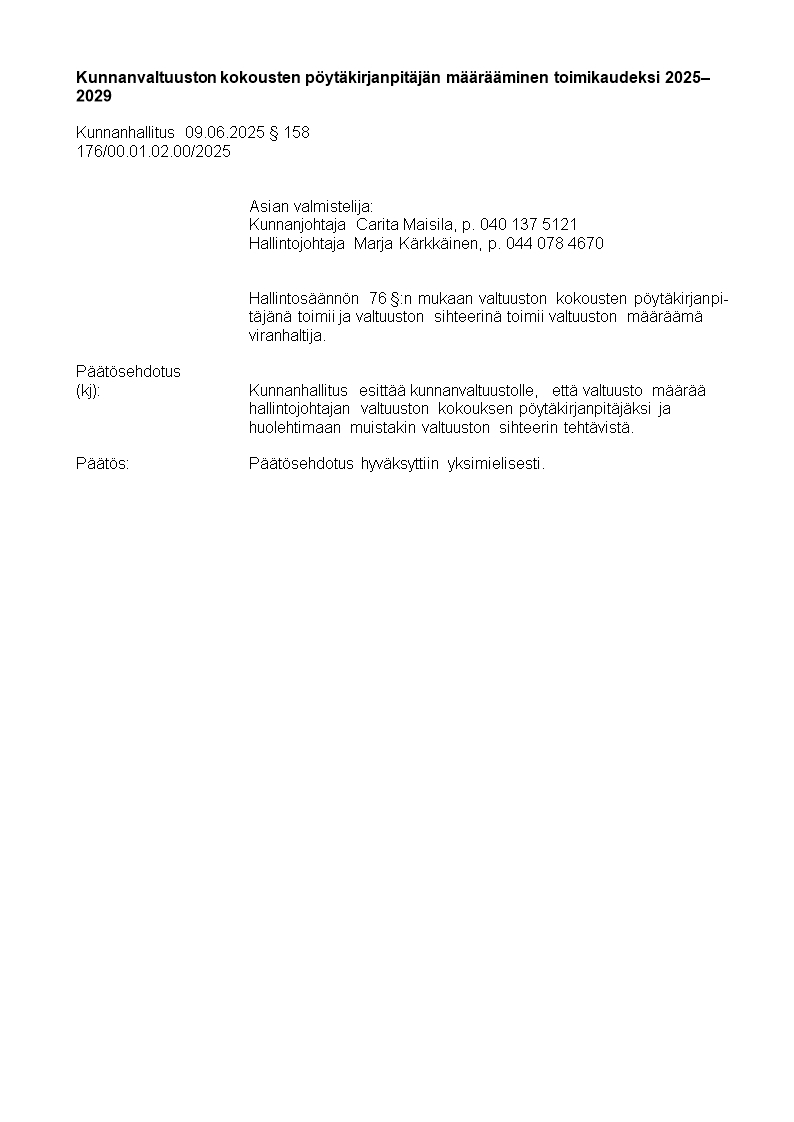 Pöytäkirja 09.06.2025/Pykälä 158