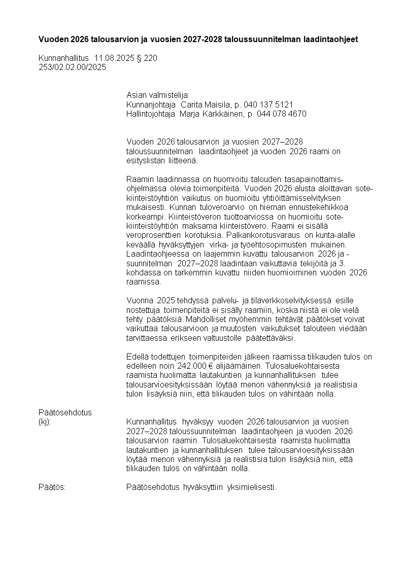 Pöytäkirja 11.08.2025/Pykälä 220