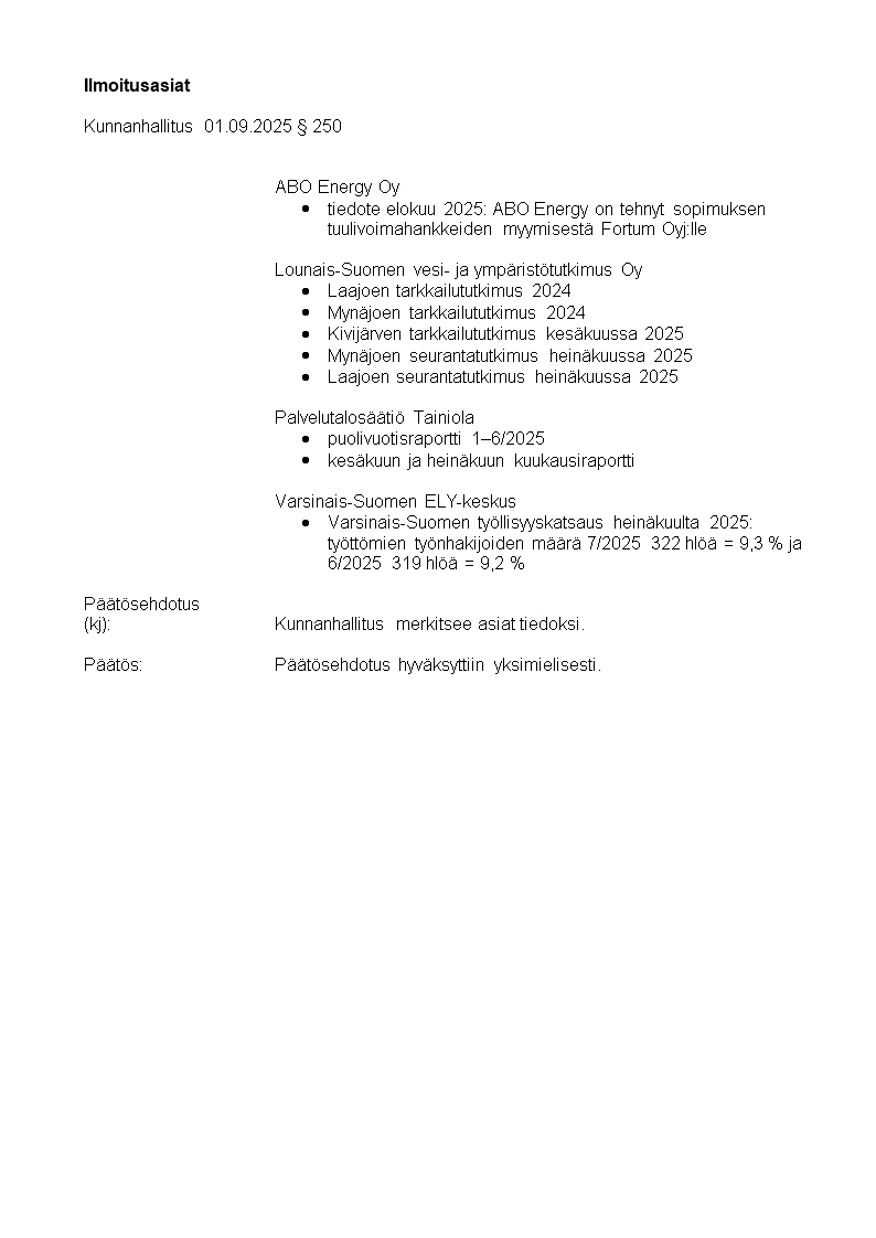 Pöytäkirja 01.09.2025/Pykälä 250