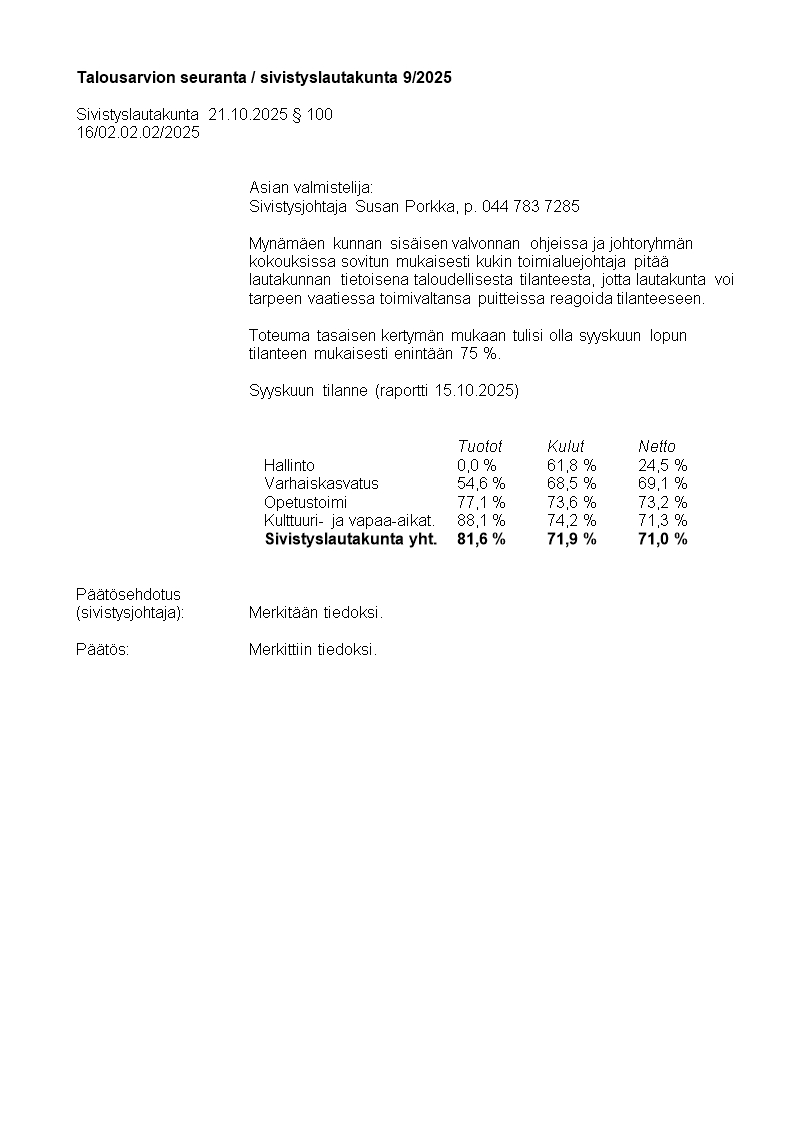 Pöytäkirja 21.10.2025/Pykälä 100