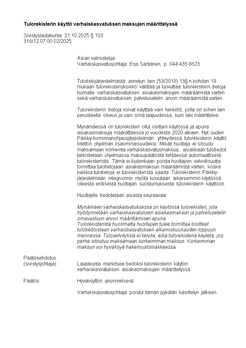 Pöytäkirja 21.10.2025/Pykälä 103