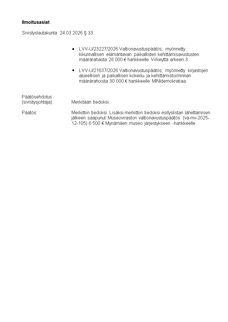 Pöytäkirja 24.03.2026/Pykälä 33