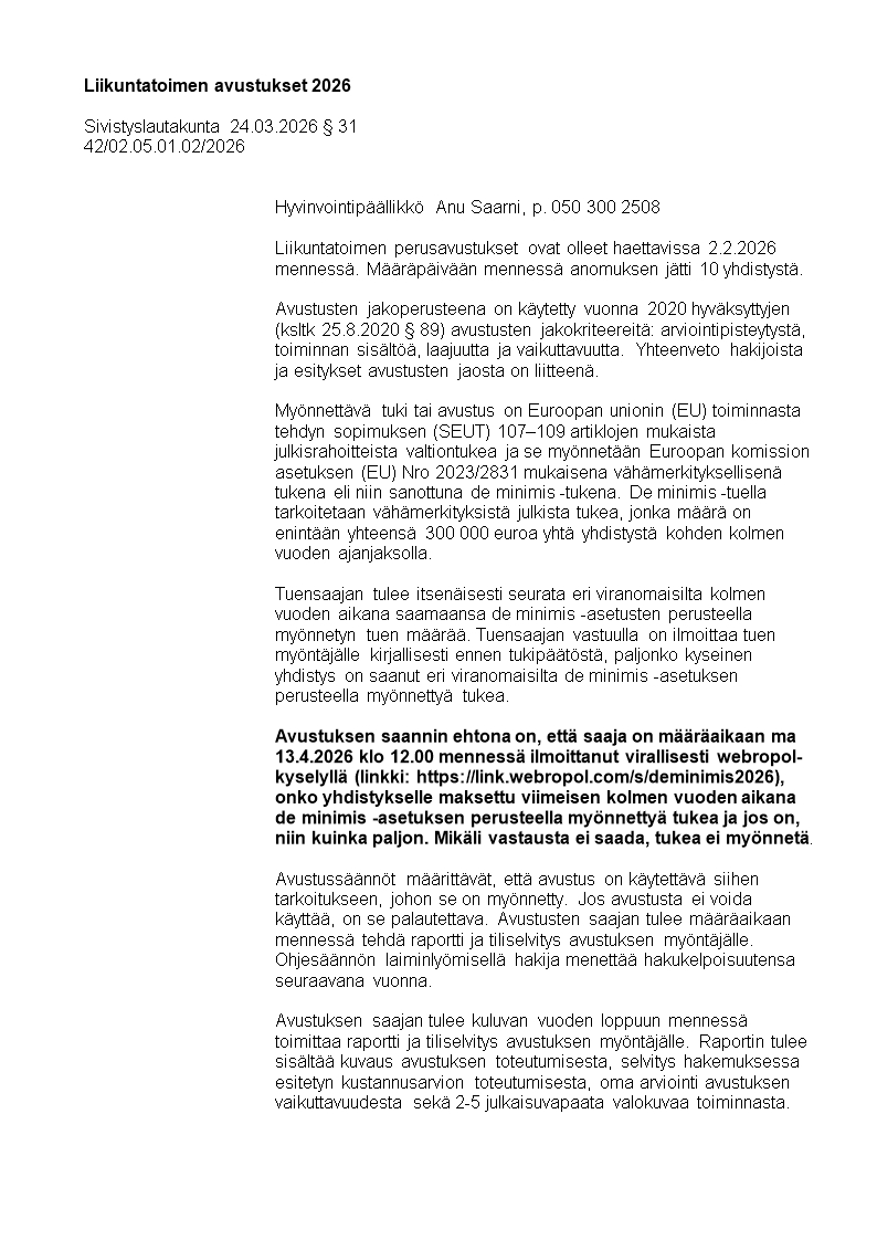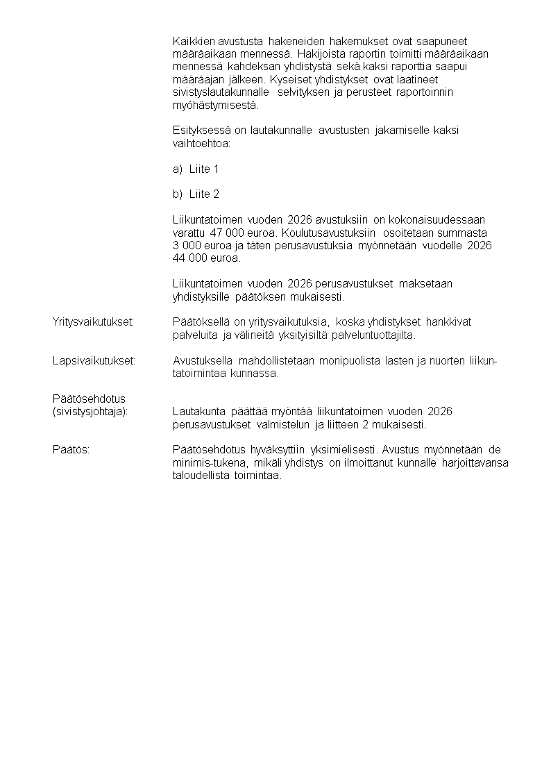 Liikuntatoimen avustukset 2026; ehdotukset 1 ja 2