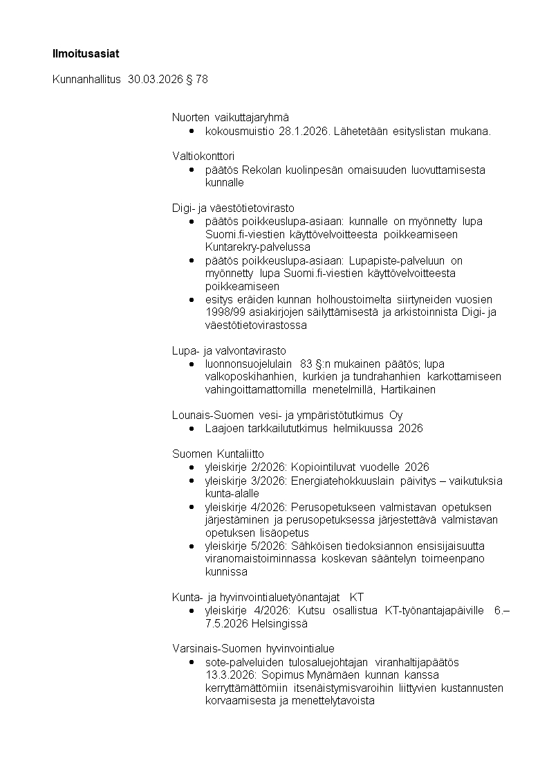 Pöytäkirja 30.03.2026/Pykälä 78
